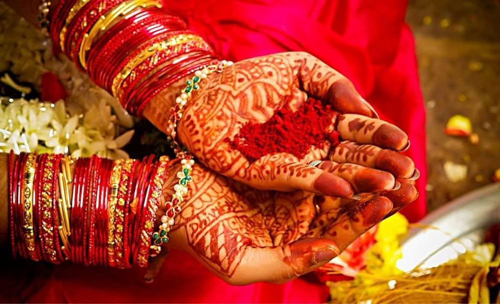 Na dit ritueel brengt de man rood poeder aan op de haarscheiding van de bruid. Het is dan tijd voor de bruiloftsgasten om het echtpaar te huldigen met bloemen en rijstkorrels. En zo begint het officiële feest met uitgebreid Indiaas eten, energieke dansen en volop gezang.